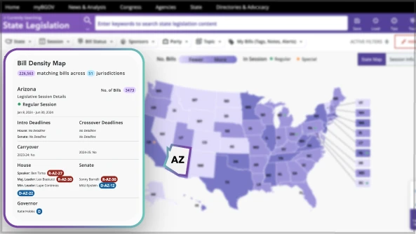 Navigate state issues seamlessly with directories, session timelines, cross-state bill tracking, and comprehensive issue analysis.