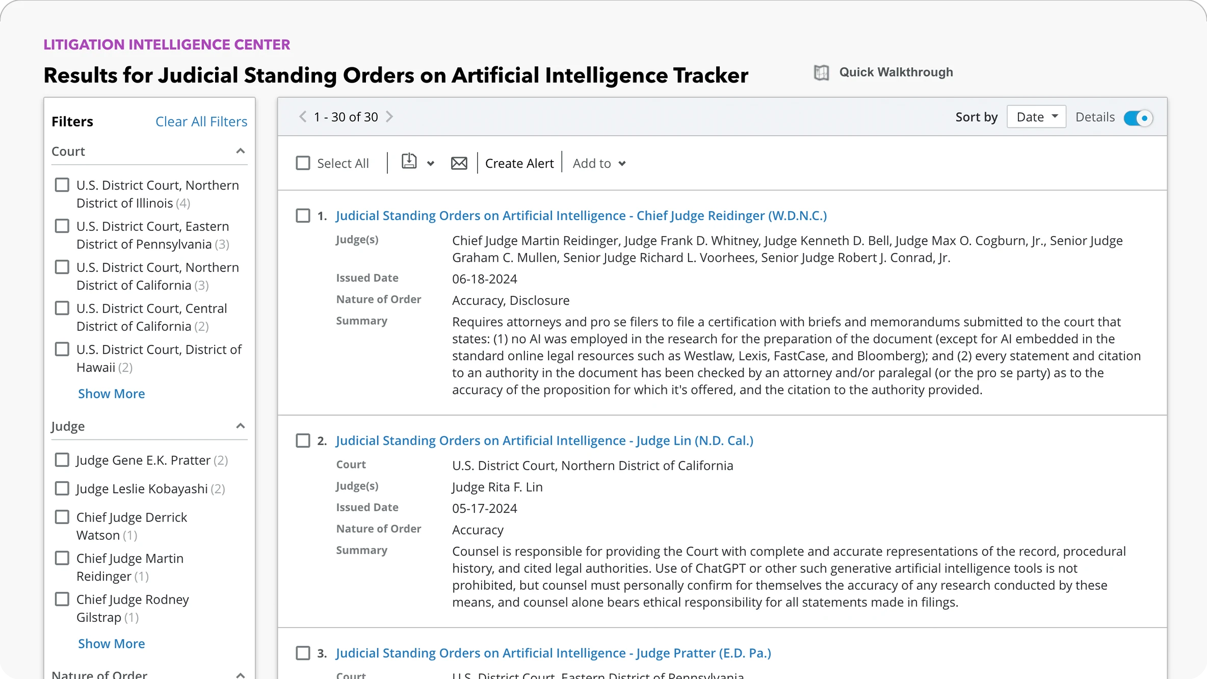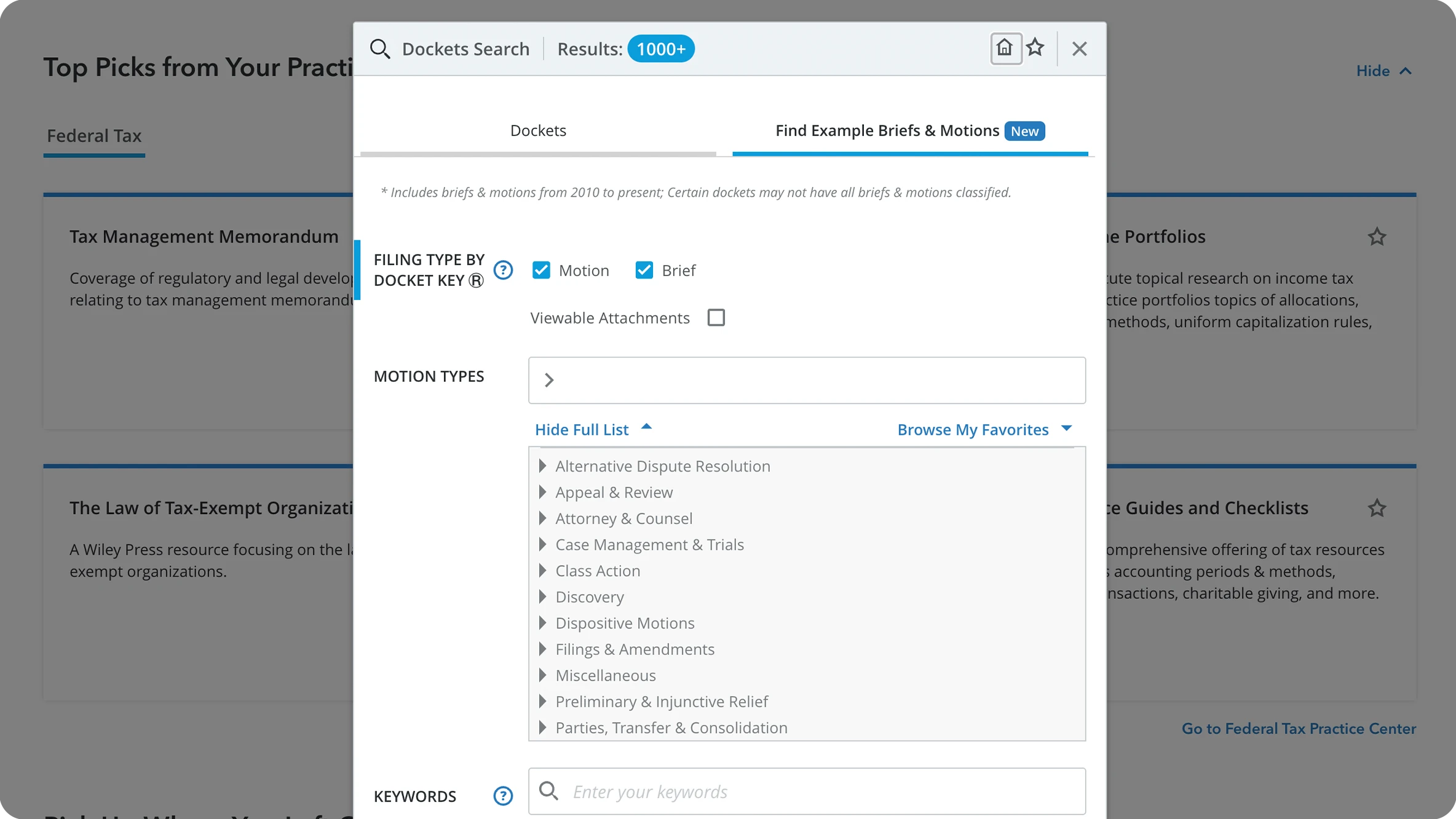 Our market-leading dockets product includes more than 1,400 state courts and complete federal courts coverage. Easily monitor new filings and never miss critical updates with alerts delivered right to your inbox. AI-powered Docket Key search functionality eliminates the time and challenges it takes to find exemplar forms like briefs and complaints in federal district civil court (20 filing types in all). Enhanced functionality with AI includes new tools such as Docket Resolutions, Docket Path (predictive analytics), and Find Example Briefs and Motions.