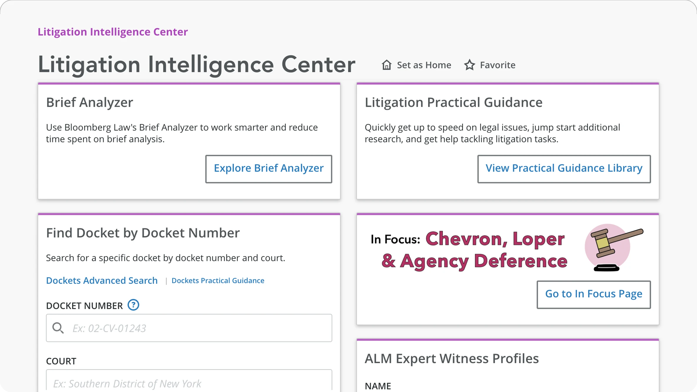 “Bloomberg Law’s Litigation Intelligence Center has everything I need for my daily litigation tasks: docket search and access; opinion search; law and regulation search. The added value features are Smart Code to quickly find court decisions interpreting a particular regulation/statutory provision and Points of Law search.”