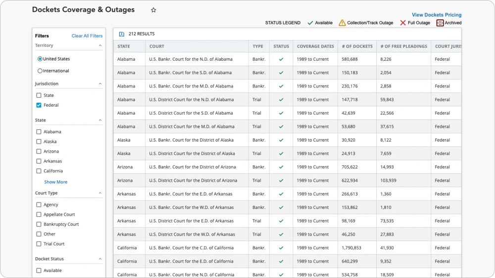 Your unlimited access to Bloomberg Law gives you the most extensive docket database in a single platform, including complete federal coverage and more than 1,000 state courts with additional courts added each month.