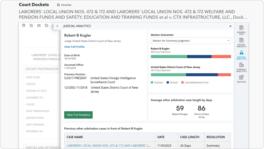 Integrate dockets with powerful AI tools such as Litigation Analytics to unlock more competitive intelligence on courts, judges, companies, attorneys, and law firms. Plus, you can connect our dockets solution with your other internal applications to bring more efficiency to your research process.