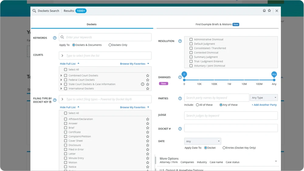 With rich filtering options, you can be more detailed in your research to locate exactly what you need. Recent enhancements like docket resolutions and damages slider extract additional insights from our database, while Docket Path℠ provides predictive insights into the likely outcomes of specific cases.