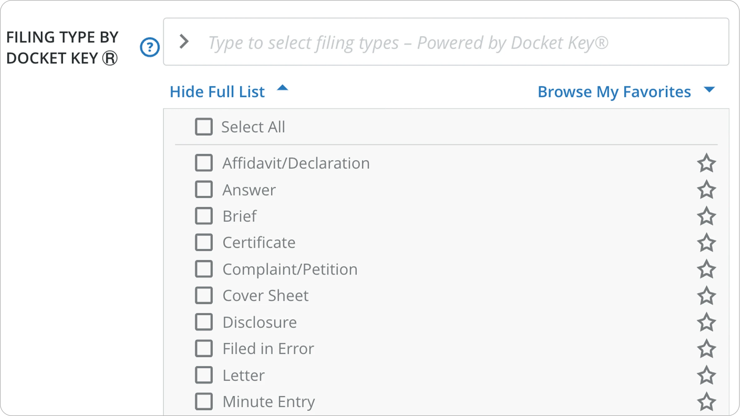 Docket Key search functionality will help you find the one form you need among millions of documents. Easily select from 20 filing types.