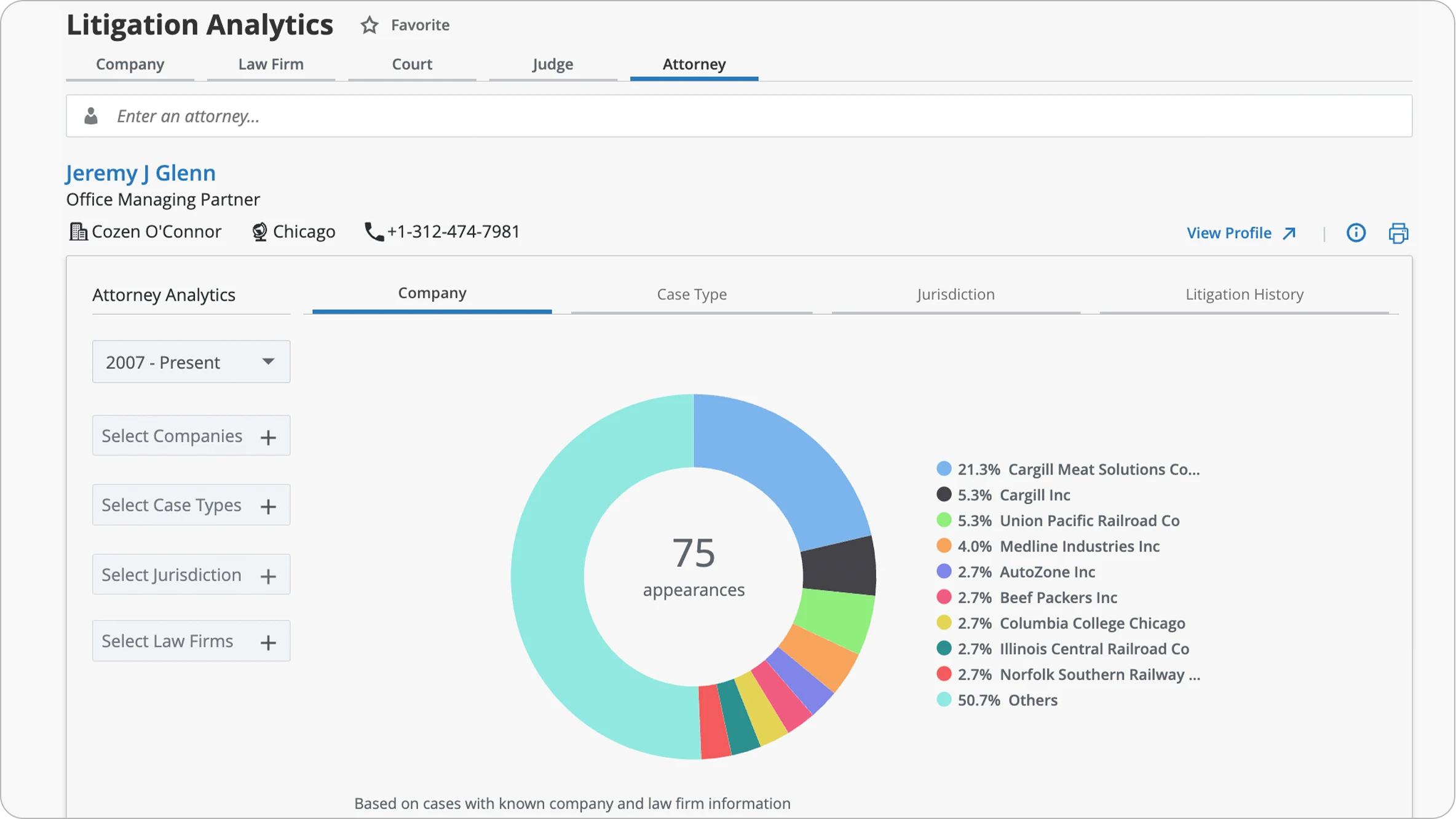 Search millions of data points by company, law firm, attorney, and judge. Litigation Analytics helps you visualize trends, predict outcomes, and develop an informed legal strategy.