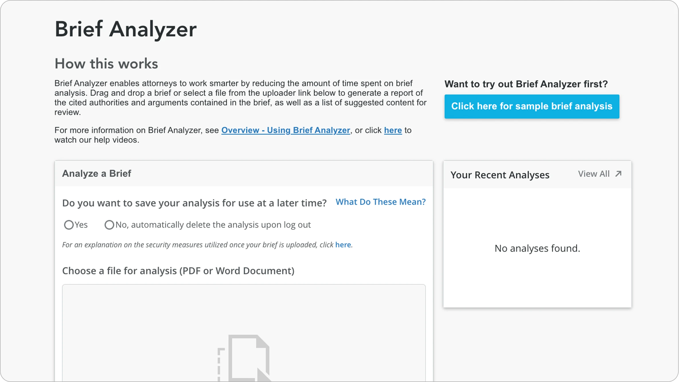 Use the power of AI to eliminate many time-consuming steps of legal brief analysis. With Brief Analyzer, easily check citations, search case law, find relevant content, and more.