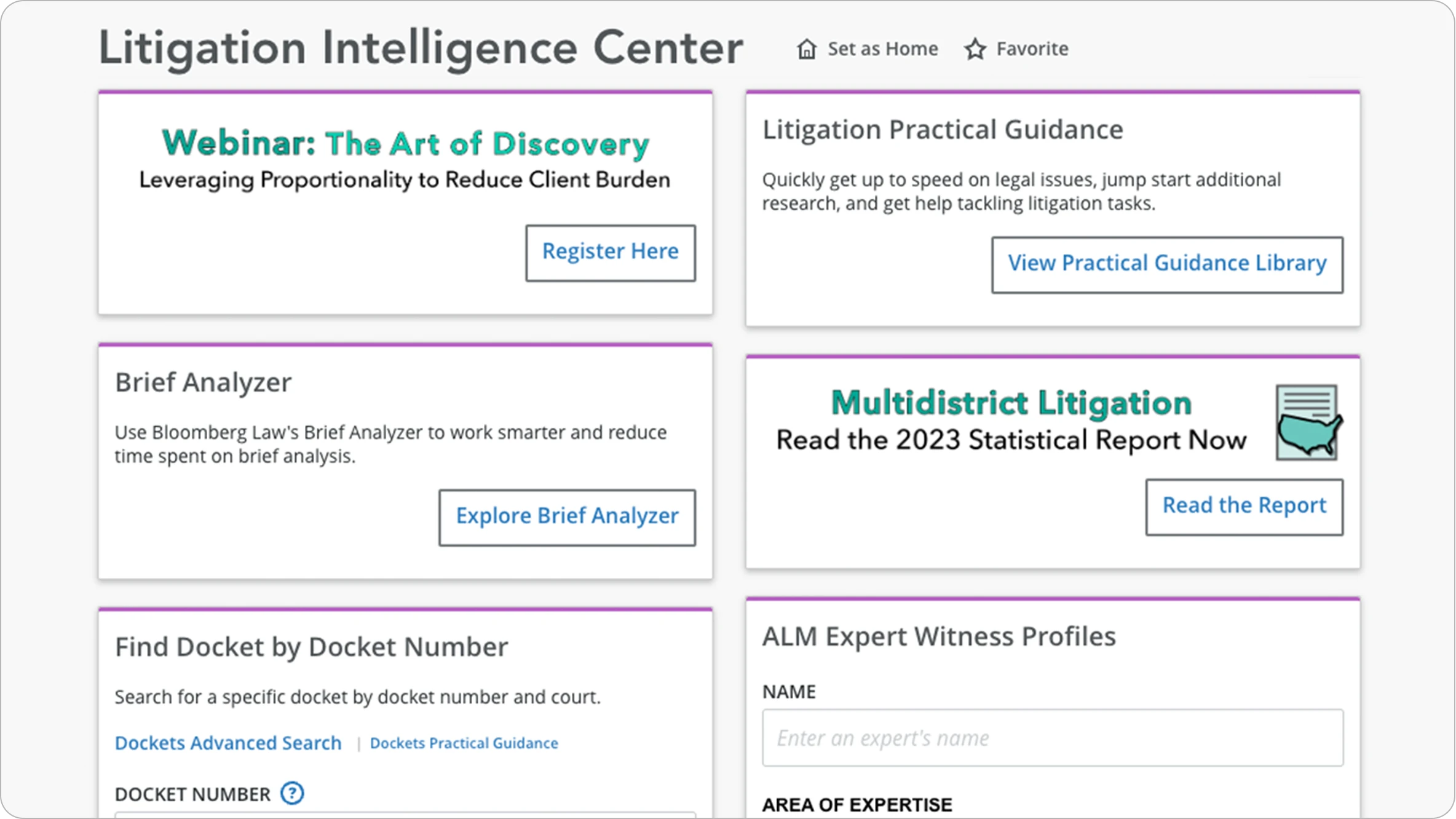 Find everything you need in the Litigation Intelligence Center, an all-in-one resource including dockets, case law, news, and legal AI tools to speed up your workflow and strengthen your case.